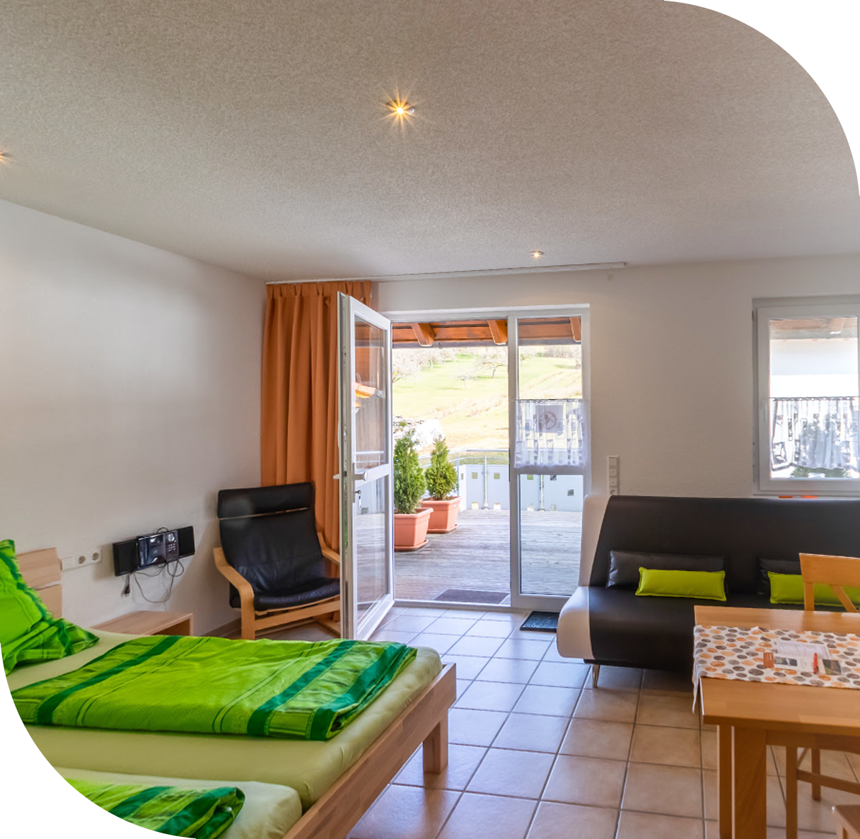 Alle unsere Ferienwohnungen begeistern mit moderner Einrichtung sowie Funktionalität. Entspannen Sie auf der Terrasse oder dem Balkon und genießen Sie dabei den atemberaubenden Ausblick auf die umliegende Natur.